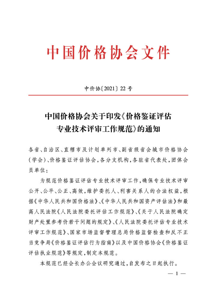 中国价格协会关于印发《价格鉴证评估专业技术评审工作规范》的通知