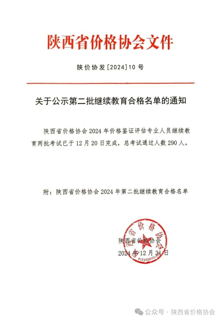 陕西省价格协会2024年第二批继续教育合格名单