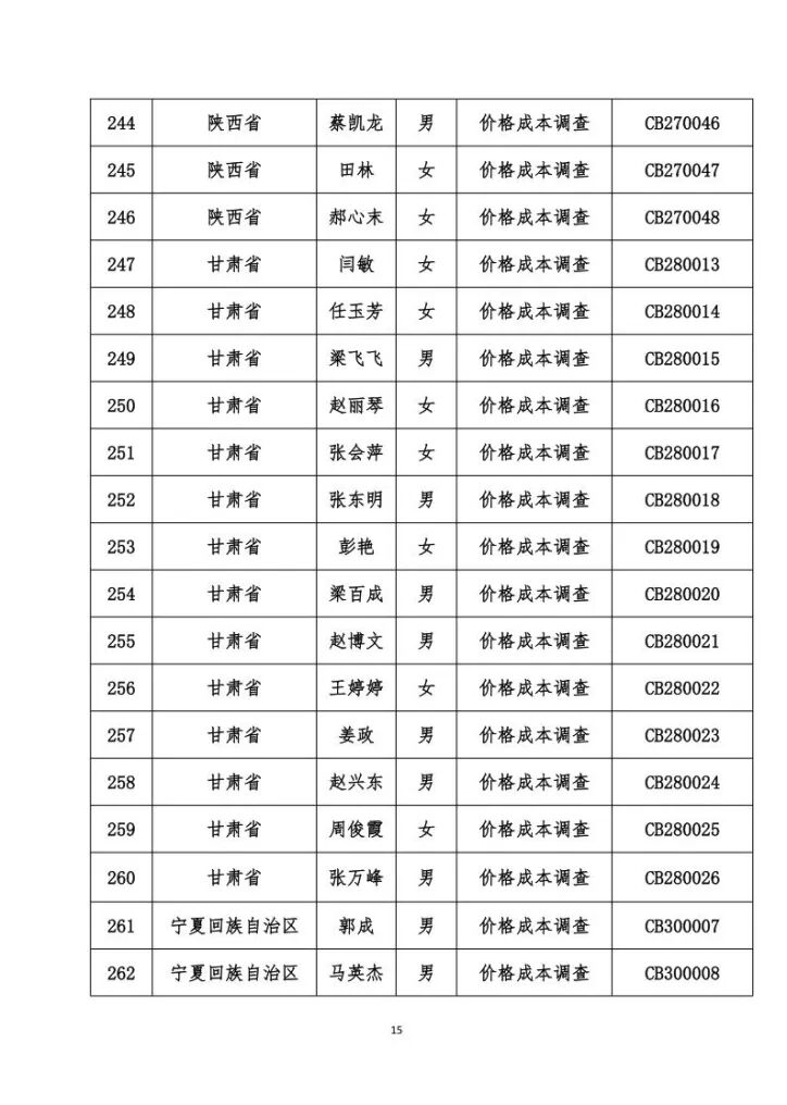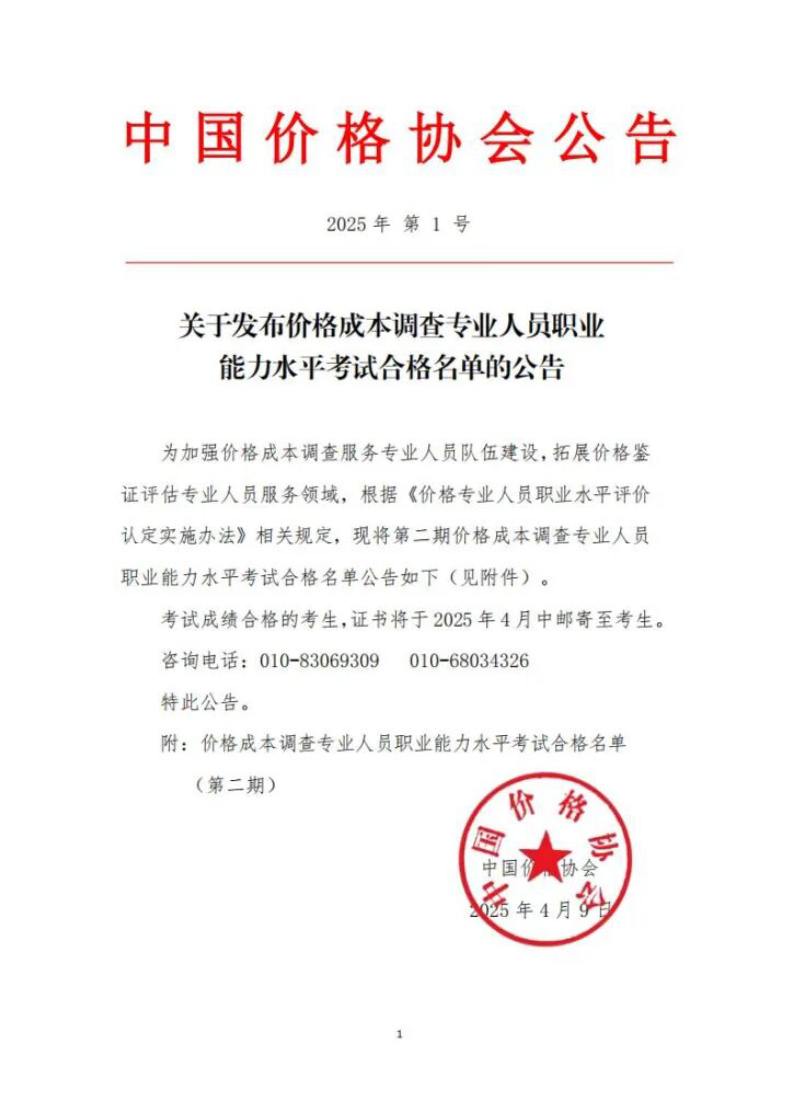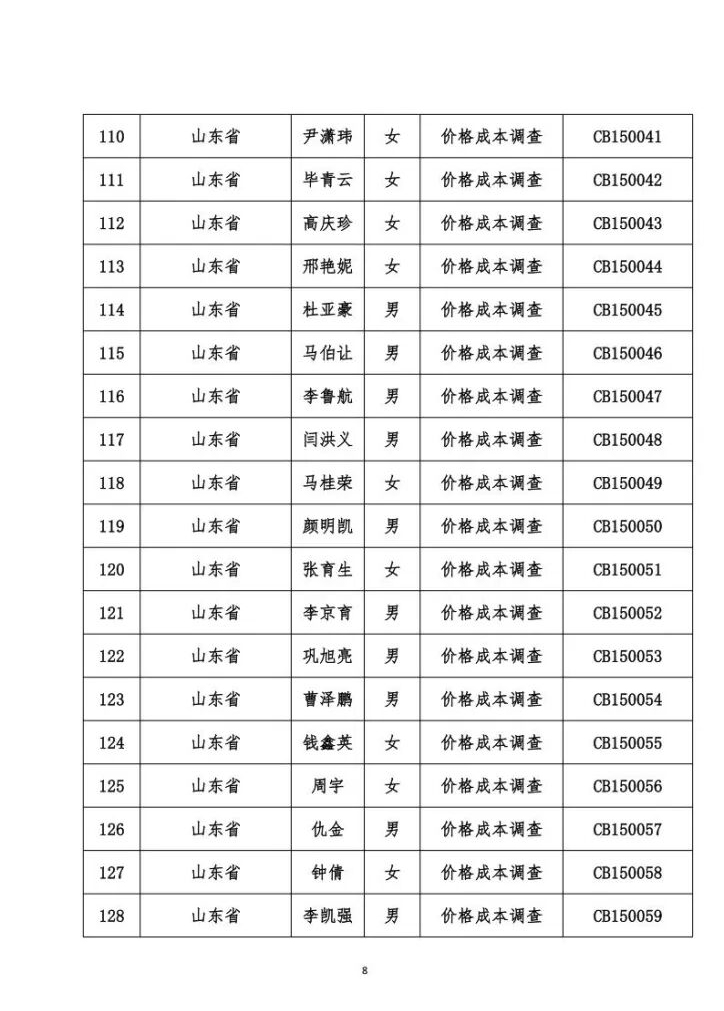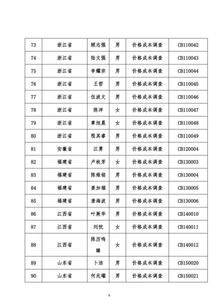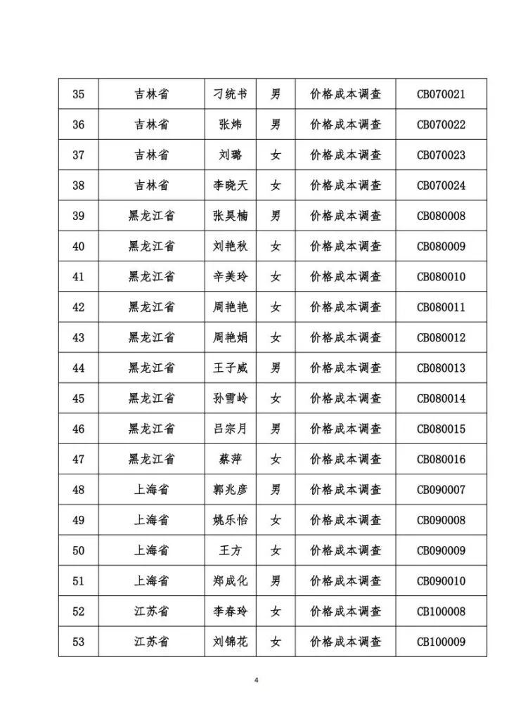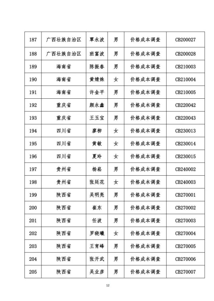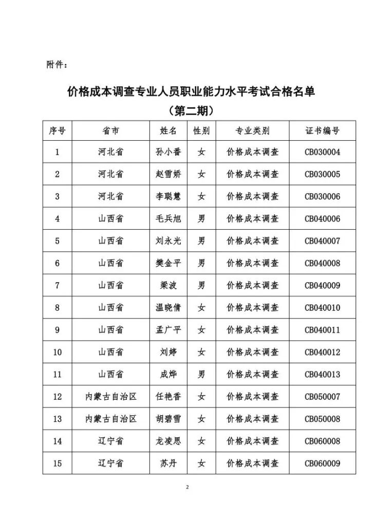 关于发布价格成本调查专业人员职业能力水平考试合格名单的公告