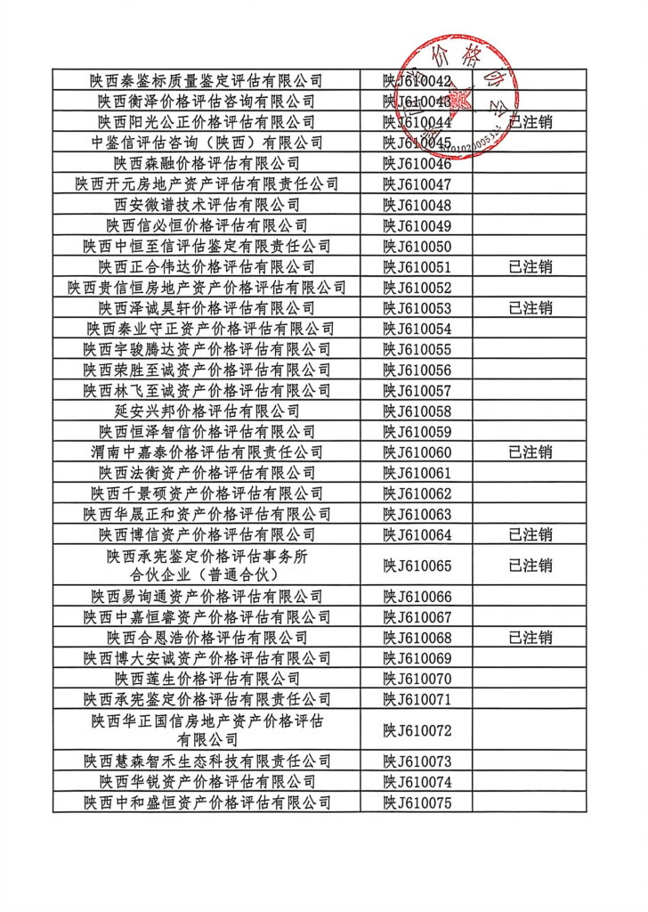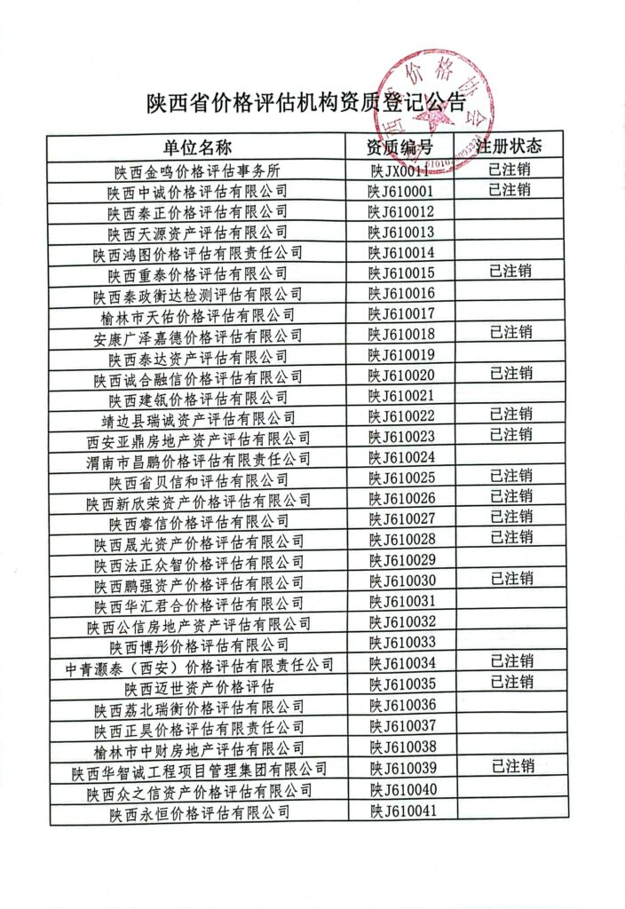 陕西省价格评估机构资质登记公告