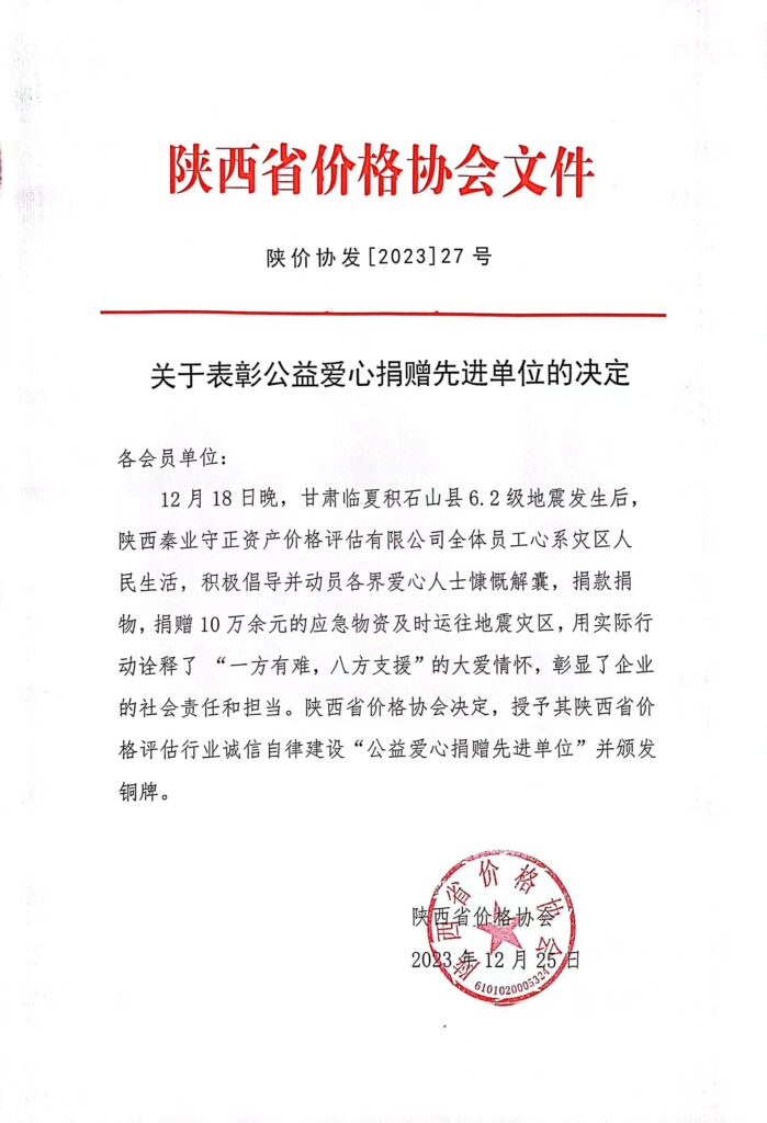 陕西秦业守正资产价格评估公司 心系灾区爱心捐